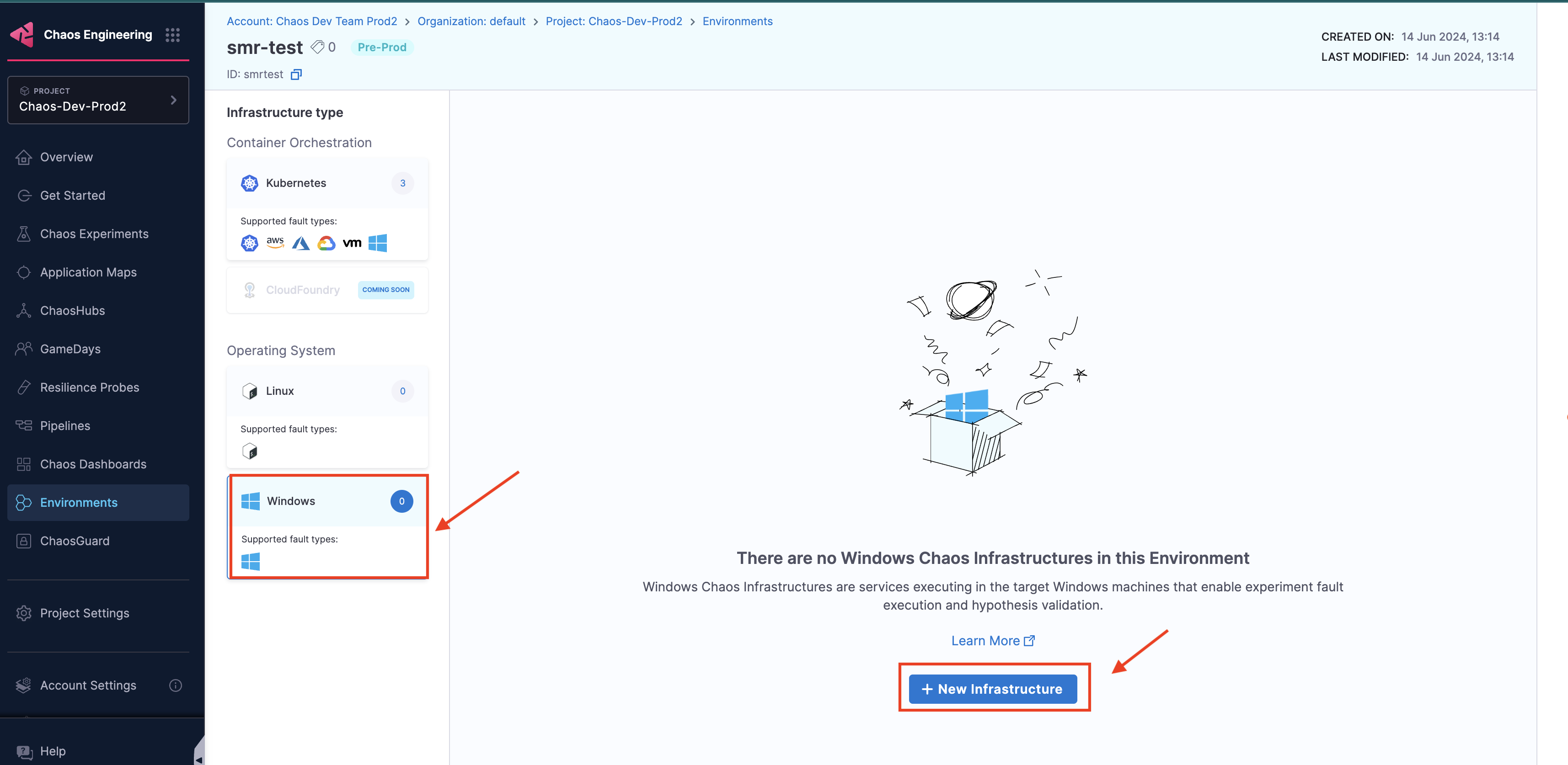 1. Select the Infrastructure Type as Windows and click New Infrastructure