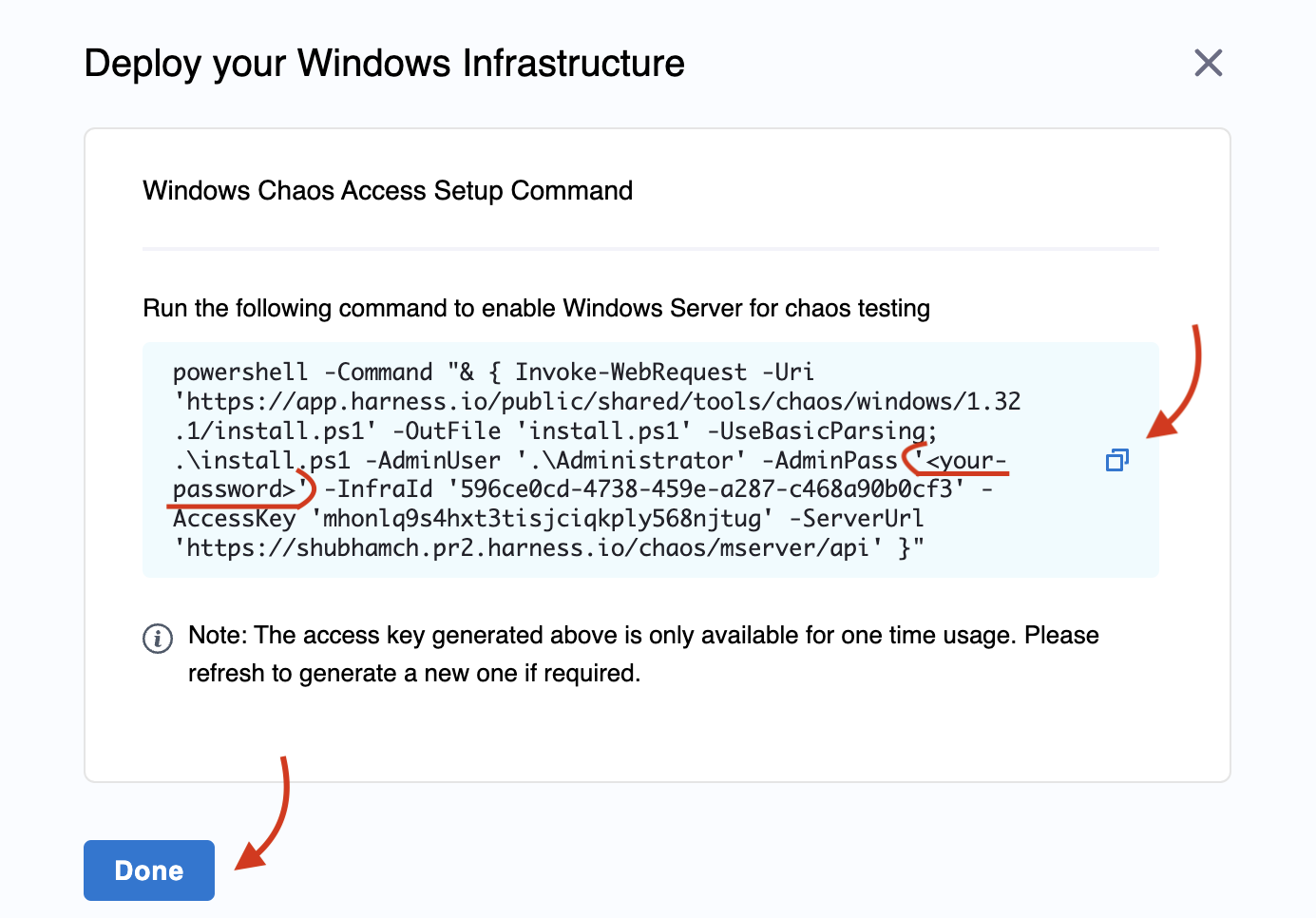 1. Copy the command generated. The prerequisites discusses how you can configure a password. If you have a password, replace it in the <your-password> placeholder. Execute this command on your terminal. Note: Administrator privileges are optional for installation, though some advanced chaos experiments may require administrator access. Click Done once you finish the execution.