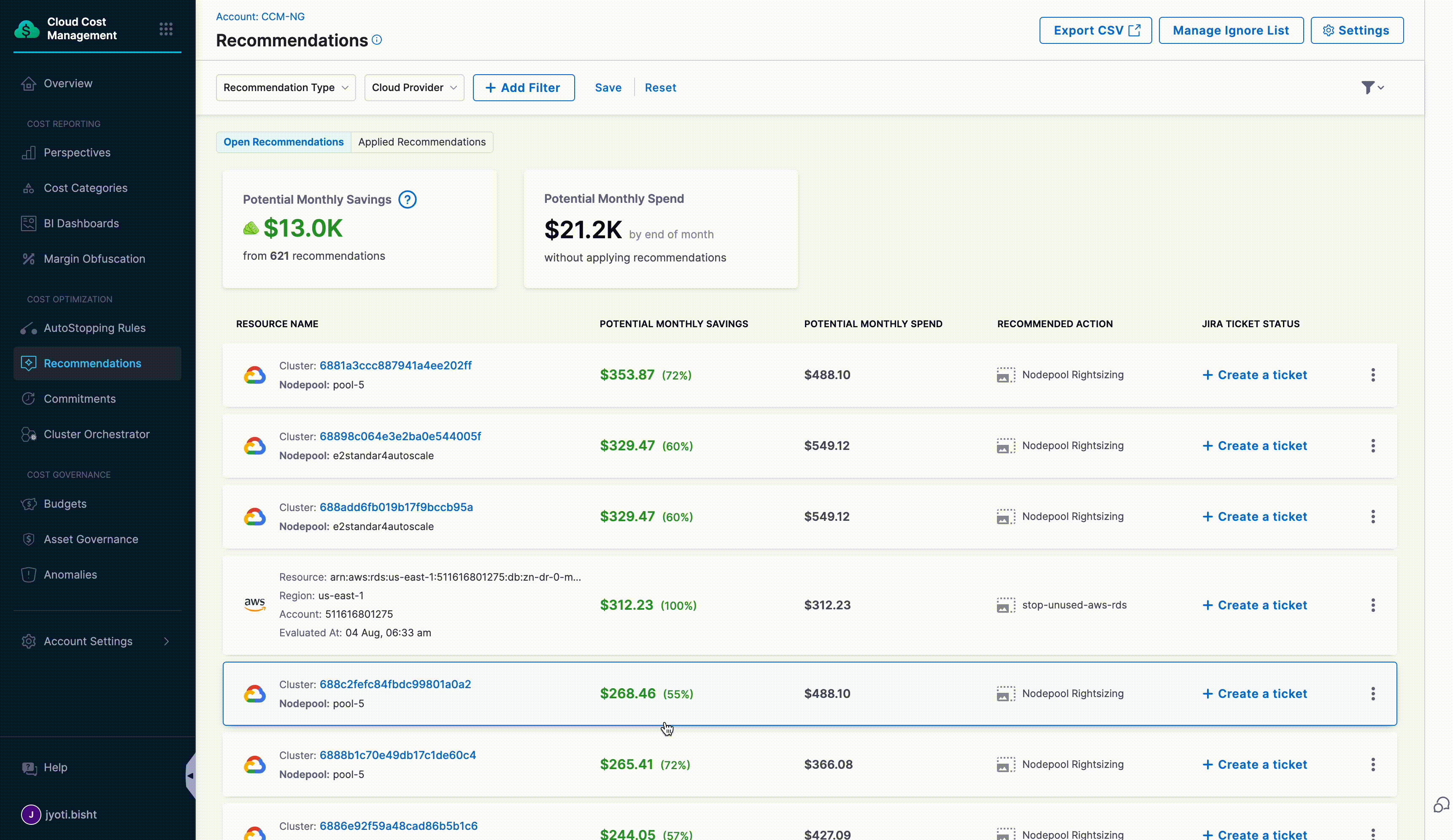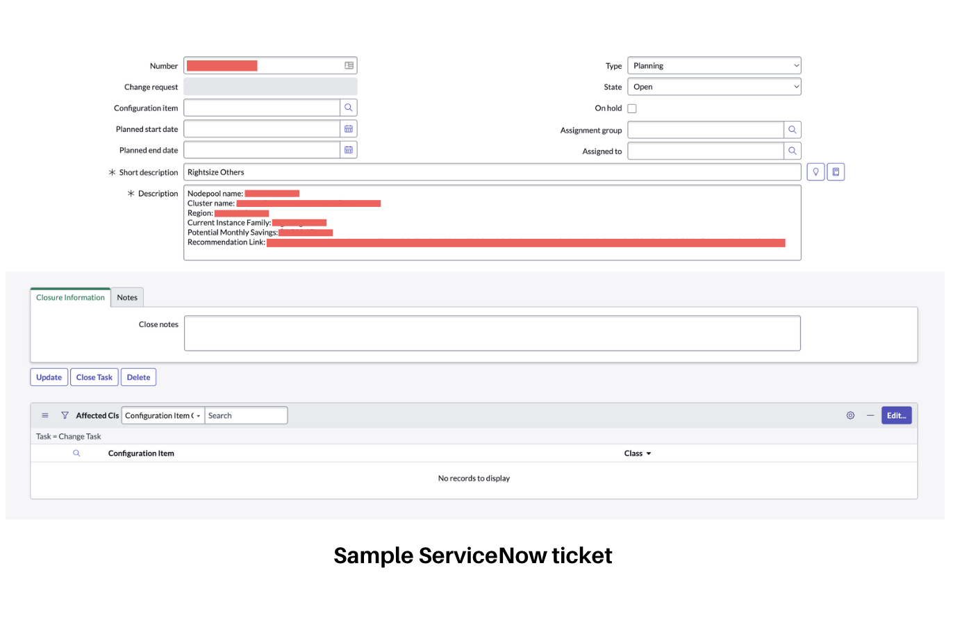 - Implement Changes and Track using Jira/ServiceNow - Apply the optimizations manually in your cloud environment. Create and manage Jira or ServiceNow tickets to monitor implementation progress