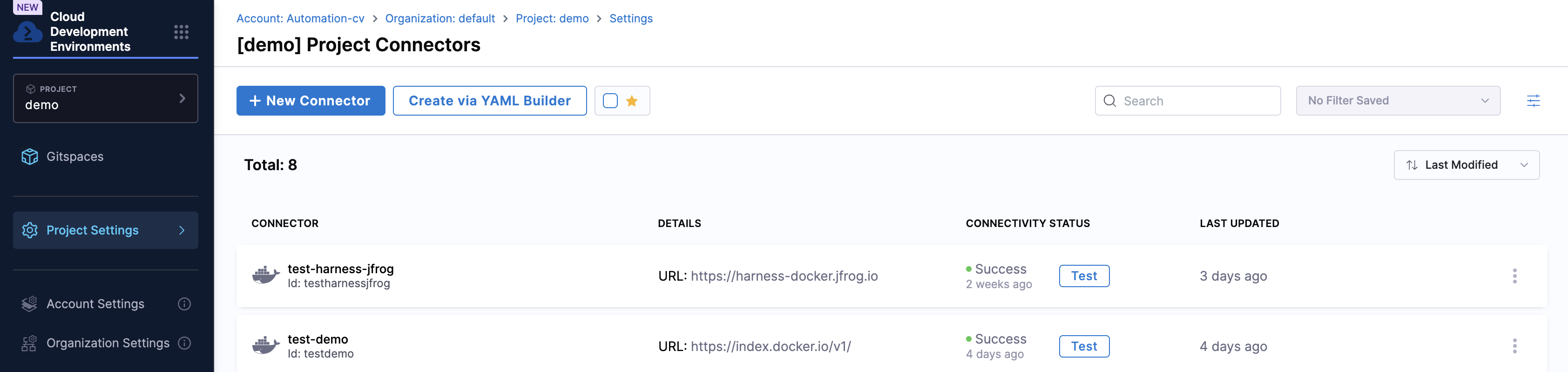 - Docker Registry: You can also configure Docker Registry as a connector to access private Docker images. Refer to this guide on adding a Docker registry.