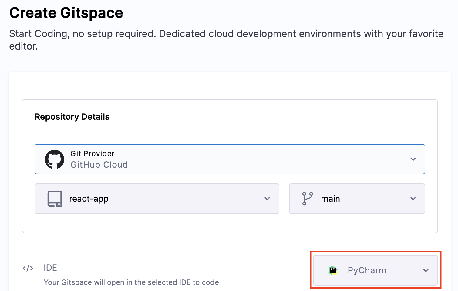 - Select "PyCharm" as the IDE during Gitspace creation.