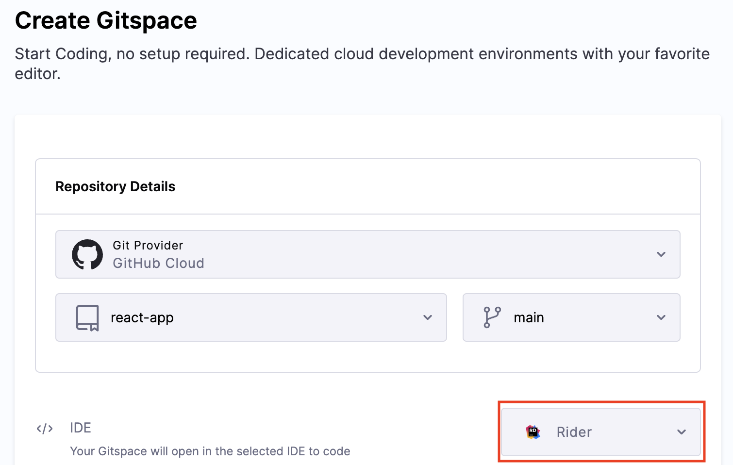 Select "Rider" as the IDE during Gitspace creation.