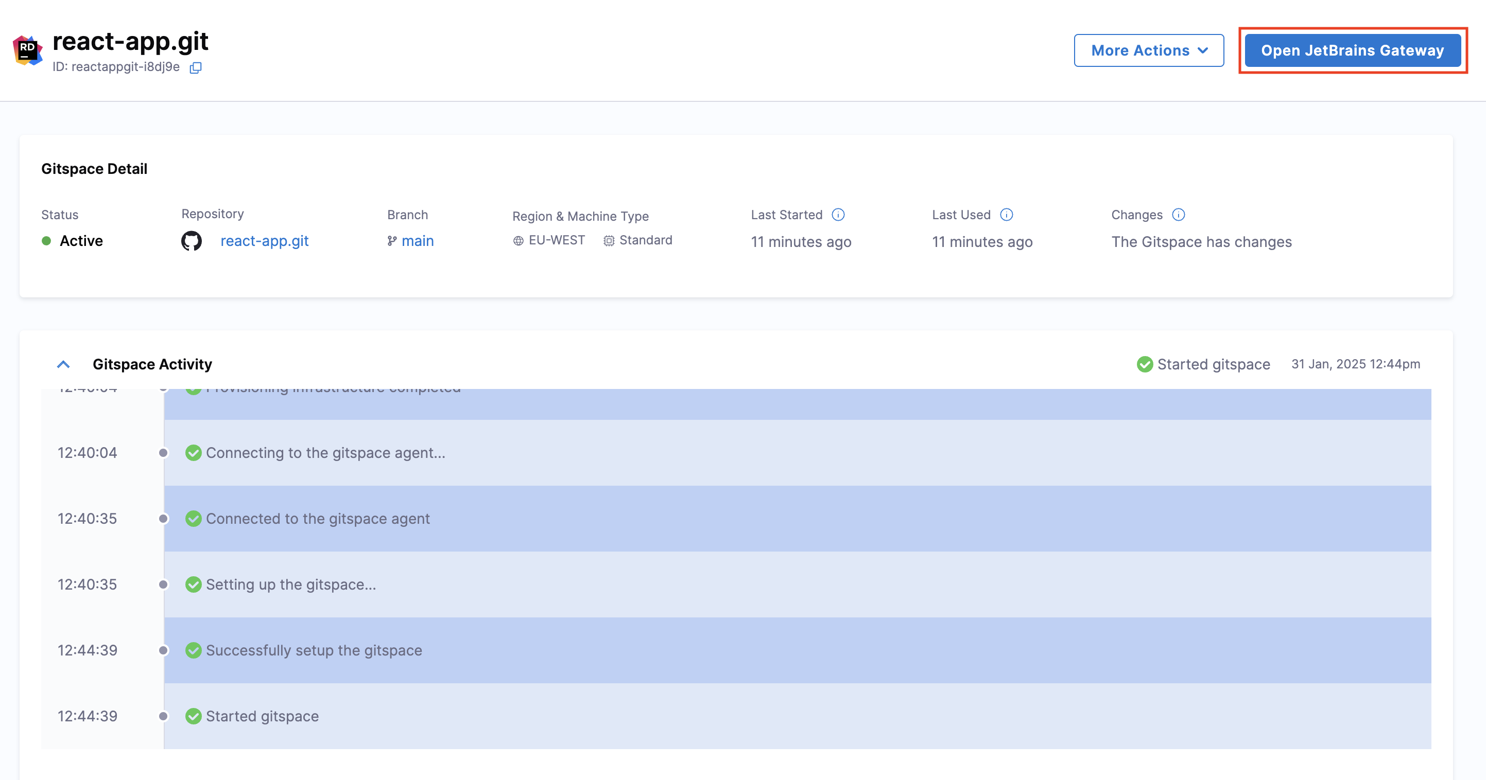 - Once the Gitspace is created and running, click on the "Open JetBrains Gateway" button.
