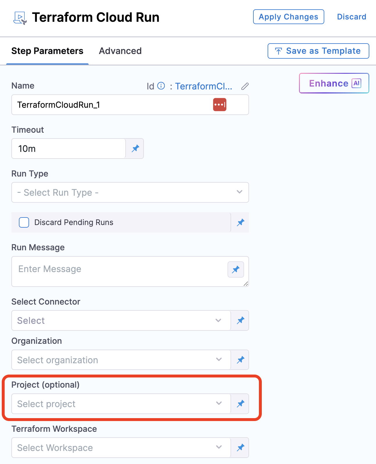 The Terraform Cloud Run step uses the Terraform Cloud connector you added to connect to your Terraform Cloud/Enterprise account and run your workspaces.
