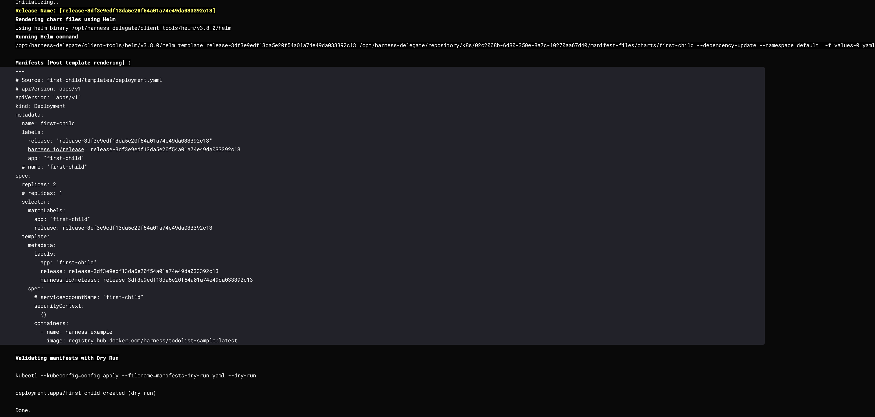 - Based on your values.yaml and Harness configured variables, Harness will then render those values via