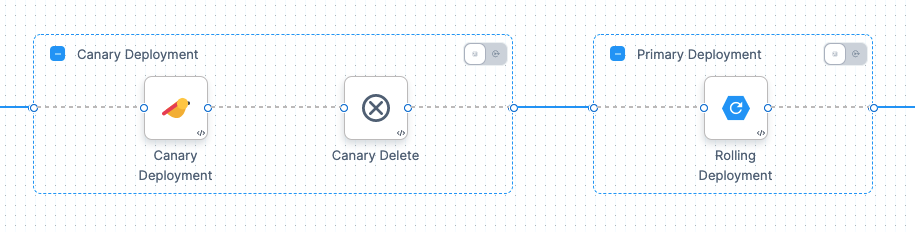 A Harness Kubernetes Canary deployment uses two phases, a Canary and a Primary Deployment group: