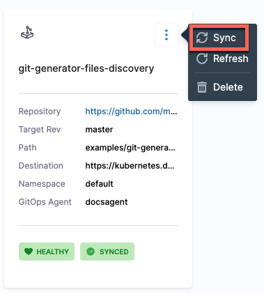 You can bulk sync or refresh your applications from the application page. In your GitOps project, go to Deployments > GitOps > Applications to get to your applications page.