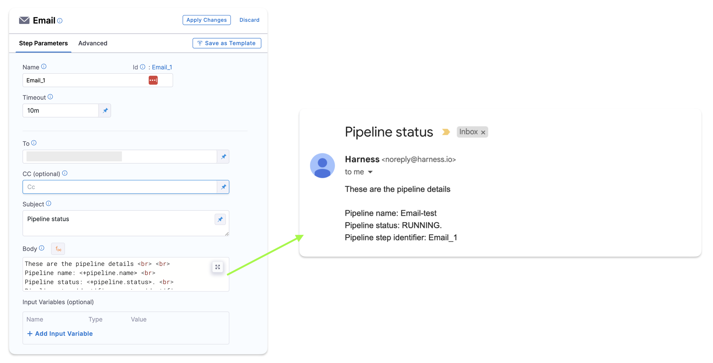 - Use input variables in the email step to customize the subject, body, and recipient list dynamically based on pipeline variables and context.