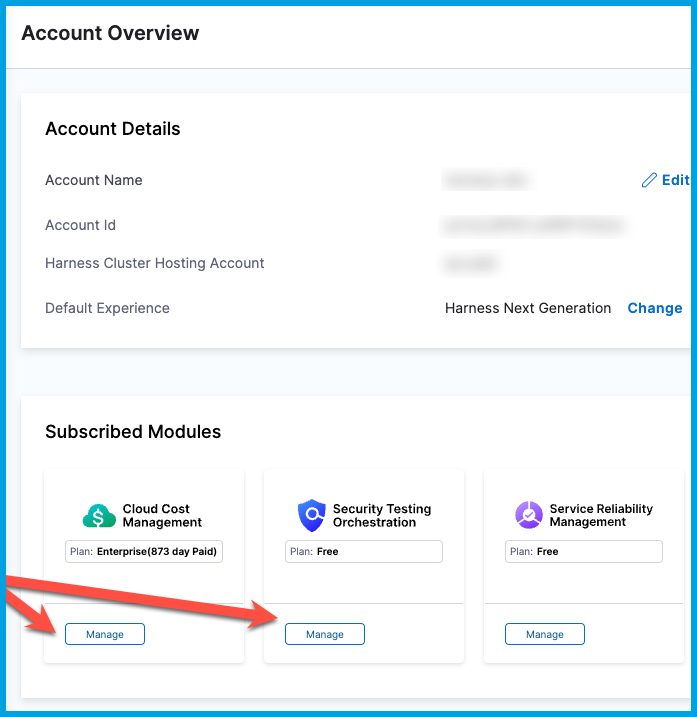 In your Harness account, go to Account Settings and Account Details to view which Harness modules you are currently subscribed to. Subscriptions are shown in the Subscribed Modules section on the Overview page. You can select Manage to go to the Subscriptions page.