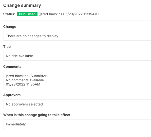 When you click review changes after making a change to a feature flag, segment, or metric, a panel displays offering a diff view of the changed elements. You can enter a title and comments for the change made to make it easier for teammates to understand why the change was made. If you want to make titles and comments required for all changes in a project, refer to the Projects guide for more information.