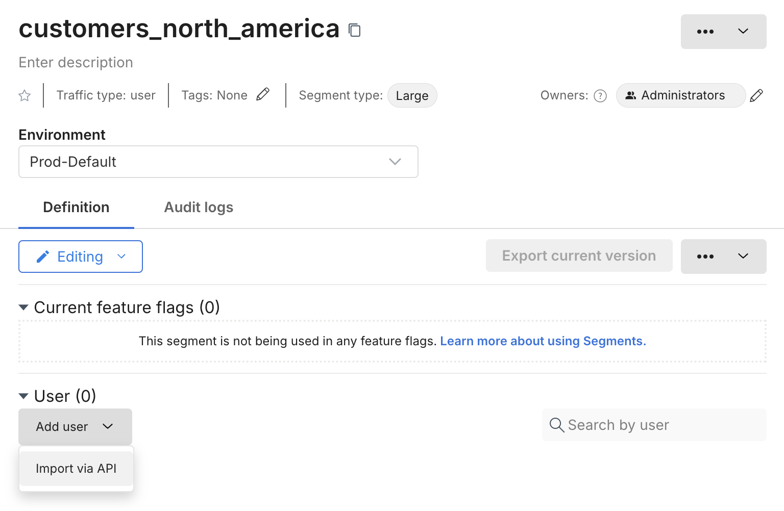 - In Harness FME, you can search a Large segment for a given User ID, but the full list of user IDs in a Large segment cannot be displayed.