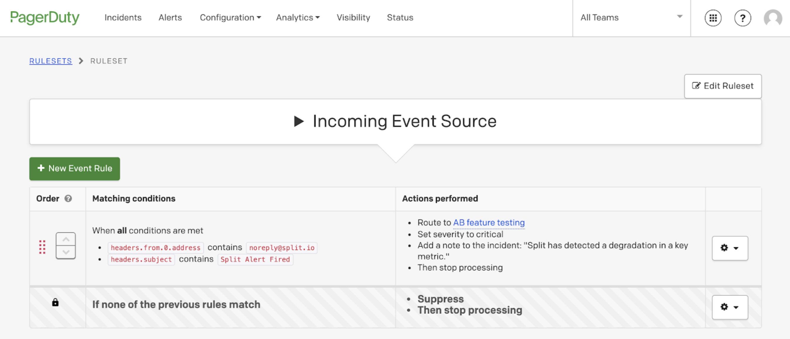 From PagerDuty’s main menu, go to Configuration and Event Rules.