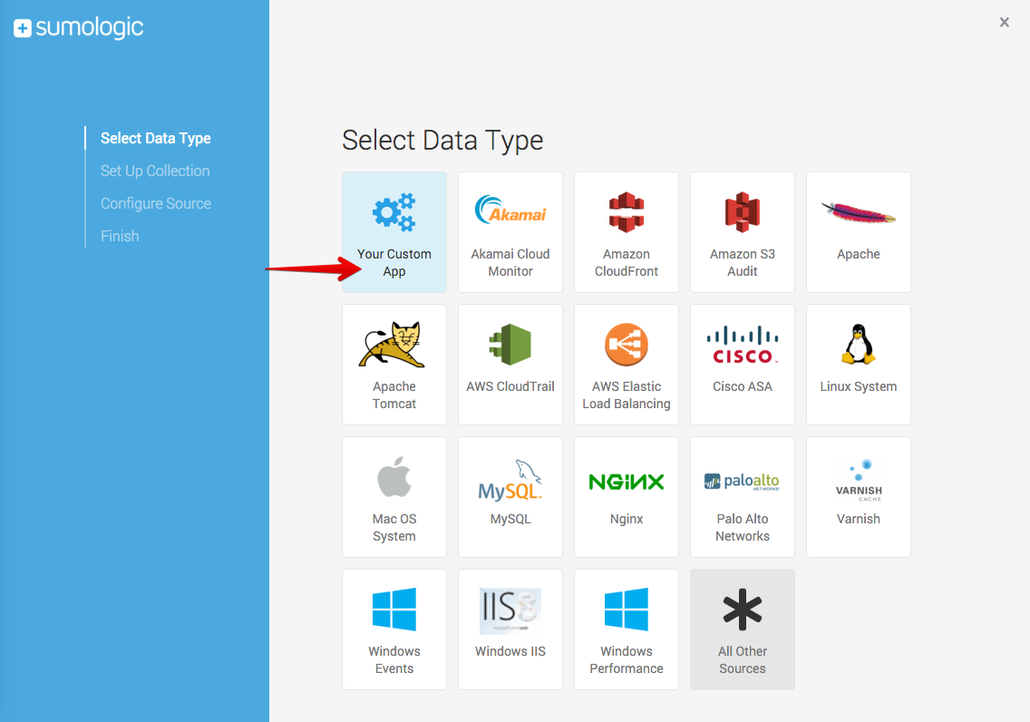 On the Select Data Type page click Your Custom App.