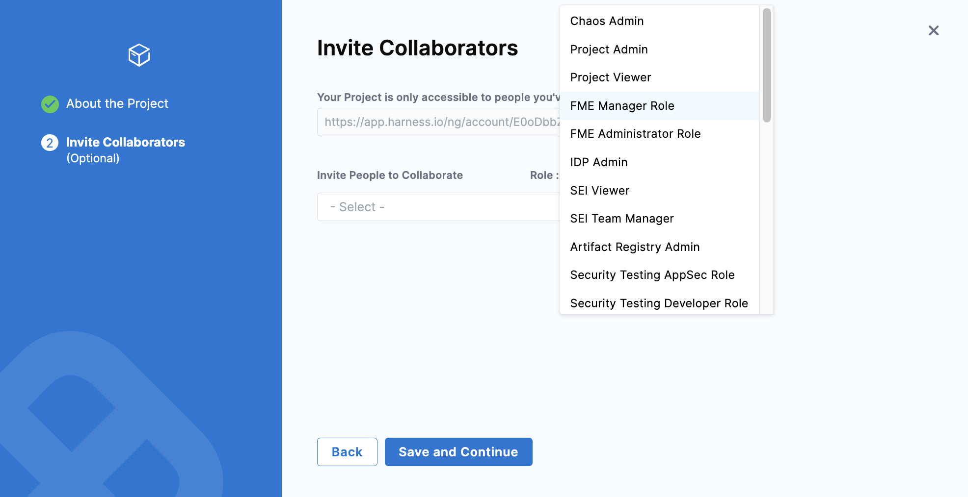 Optionally, invite people to collaborate in the project by selecting a role from the dropdown menu (like