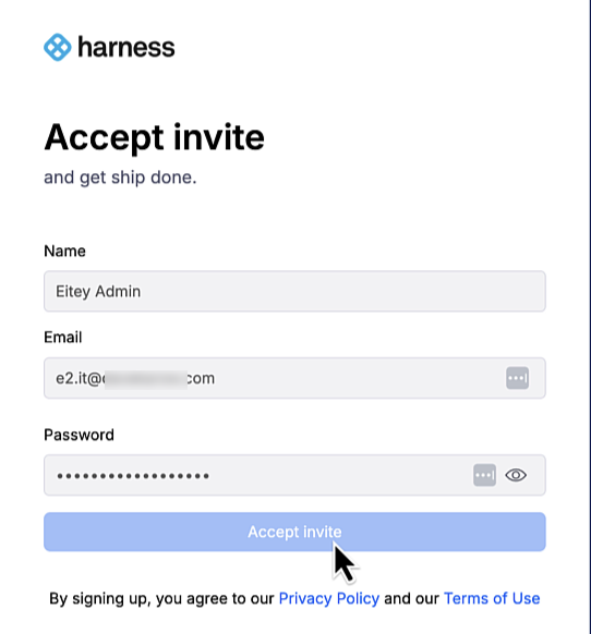 When they click Accept Invite, they are taken to this screen to enter their preferred display name and email, and to set their initial password: