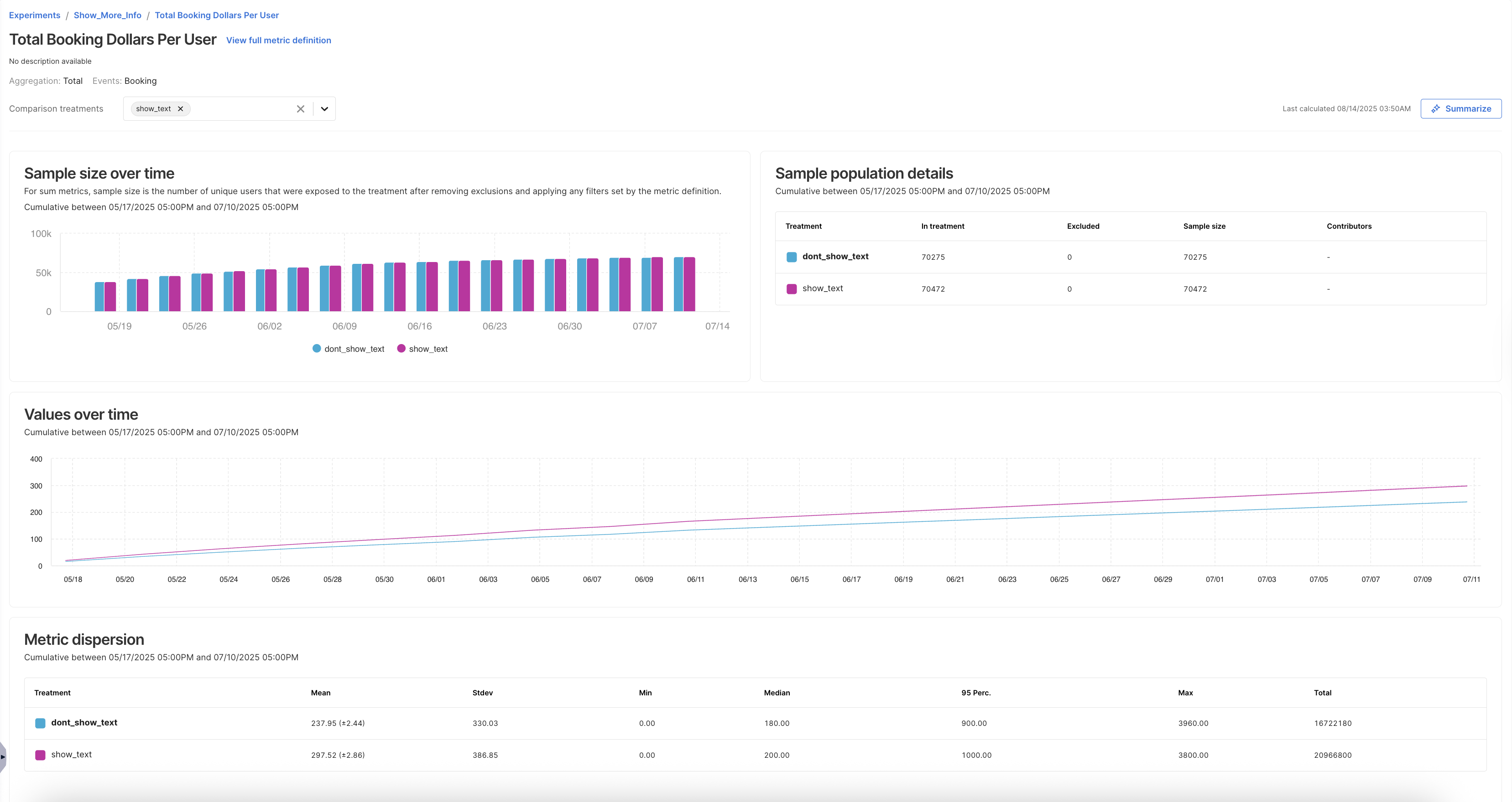 Explore how each metric performs across treatments, inspect query-based data directly from your warehouse, and understand how results are calculated based on your metric definitions.