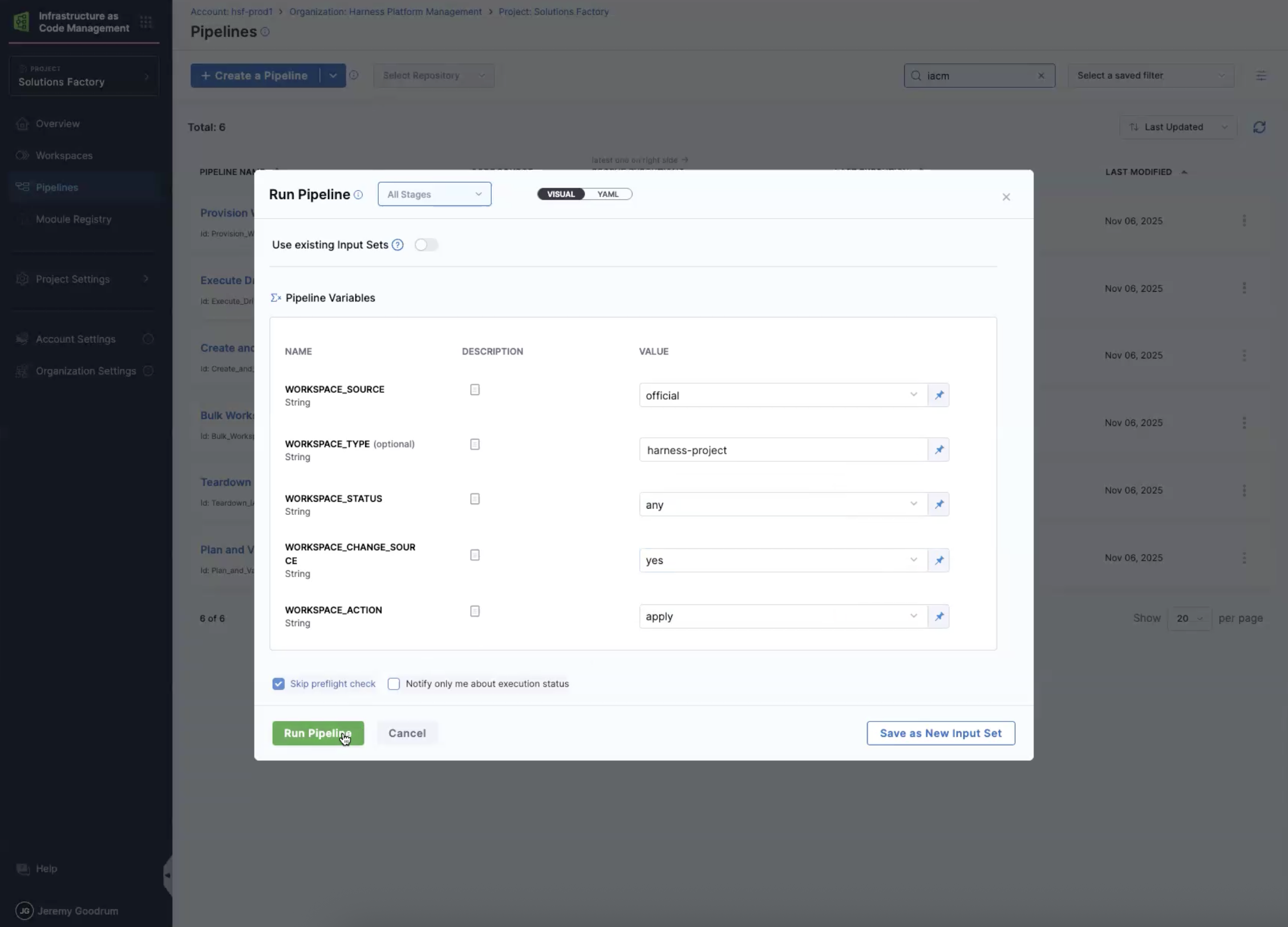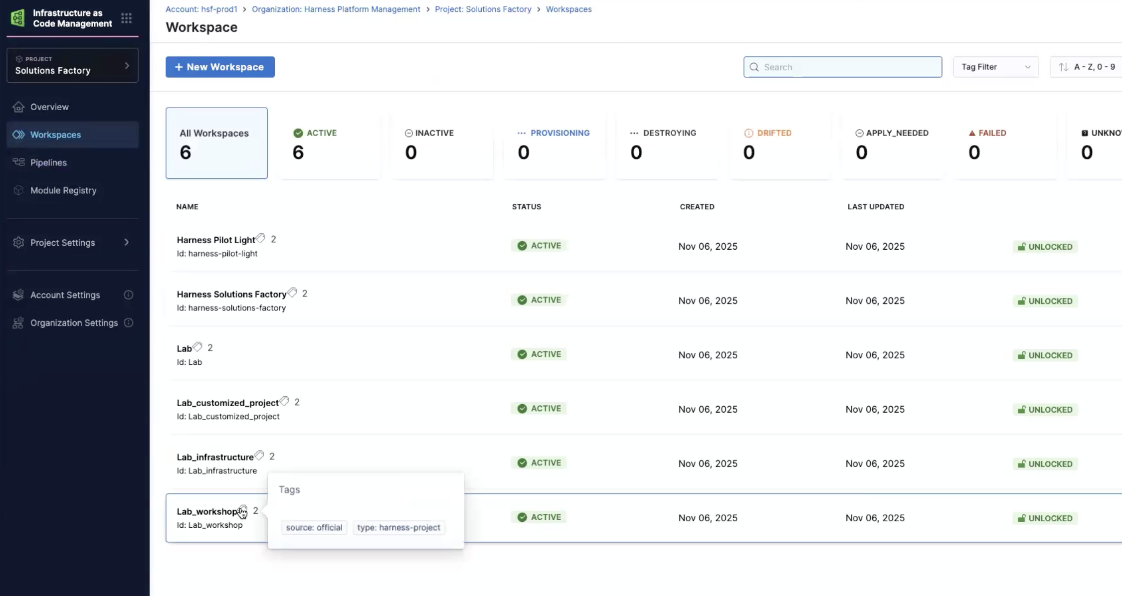 custom-harness-template-library— Go to Pipelines and runBulk Workspace Management