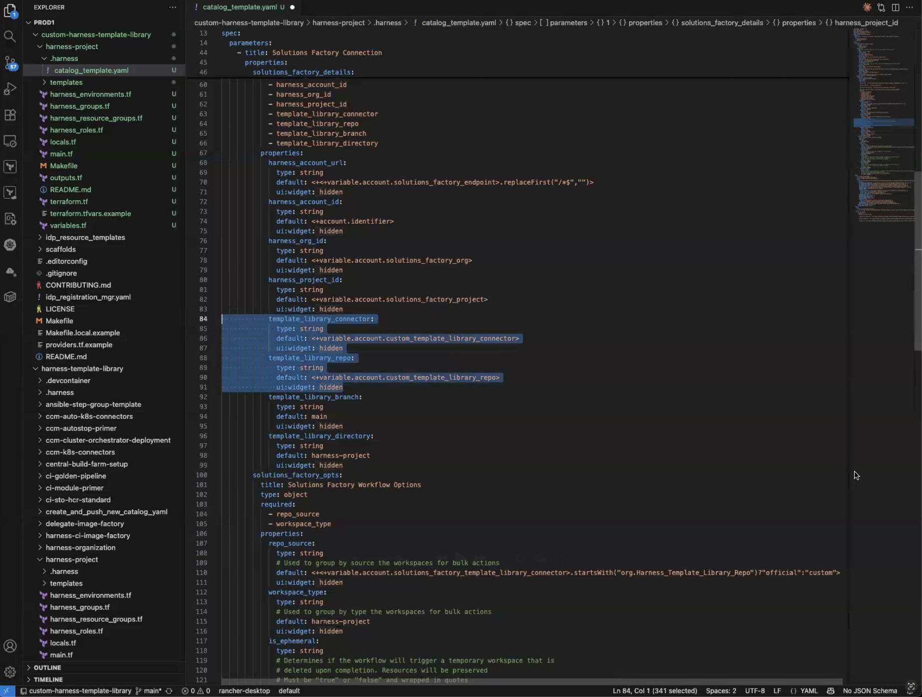 custom-harness-template-library/harness-project/.harnessgo intocatalog_template.yamland find the propertiestemplate_library_connectorandtemplate_library_repoand paste in the Ids from above after “variable.account.” It should look like this: