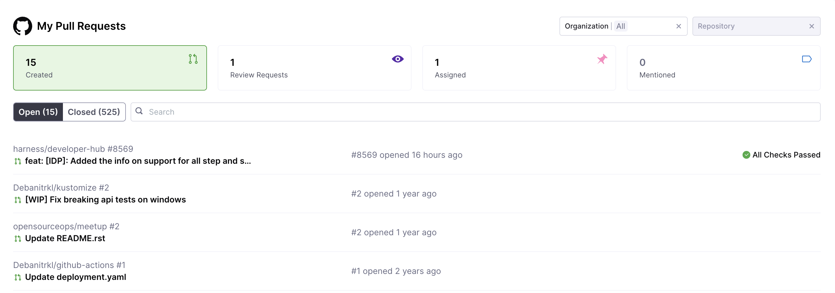 The numbers displayed at the top, such as "15 Created," "1 Review Requests," and "1 Assigned" only reflect open pull requests, even though the card also contains information on closed pull requests, as seen by the "Closed (525)" tab.