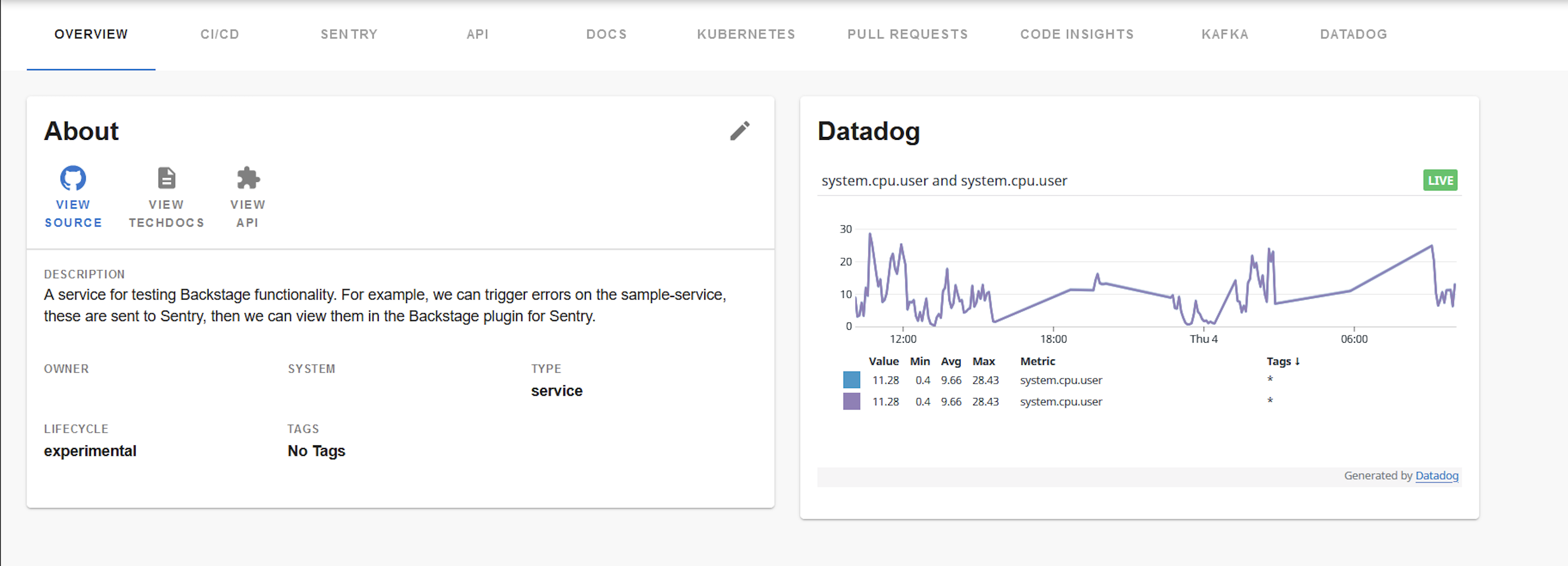 This plugin exports the EntityDatadogGraphCard that you can show on the Overview tab of a service or any other layout page. The following configuration is set by default in Layout under Admin for Service and you do not need to change anything: