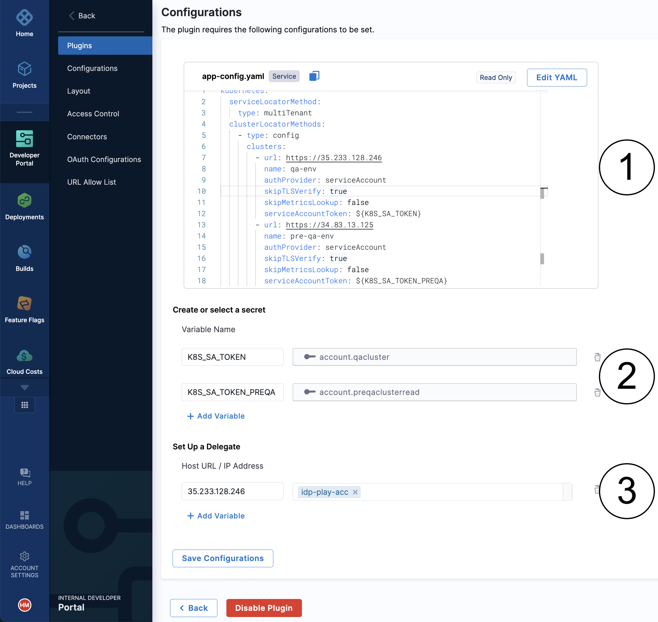 A plugin configuration allows you to define variables whose values are secrets. The variables can be used in the application configuration YAML file. The secret is usually an API key for the third-party provider that the plugin supports. Any secret variable defined as ${} in the application configuration YAML file must have a corresponding secret value defined. The secrets configured in IDP are stored in the Harness platform's built-in secret manager or your own secret manager. In case you are using your own secret manager, you will need to configure a Delegate proxy like the one below and ensure the delegate has access to your secret manager.