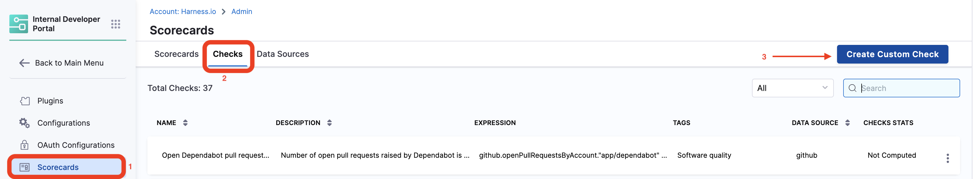 - Under Admin section select Scorecards, now go to Checks tab and select Create Custom Check