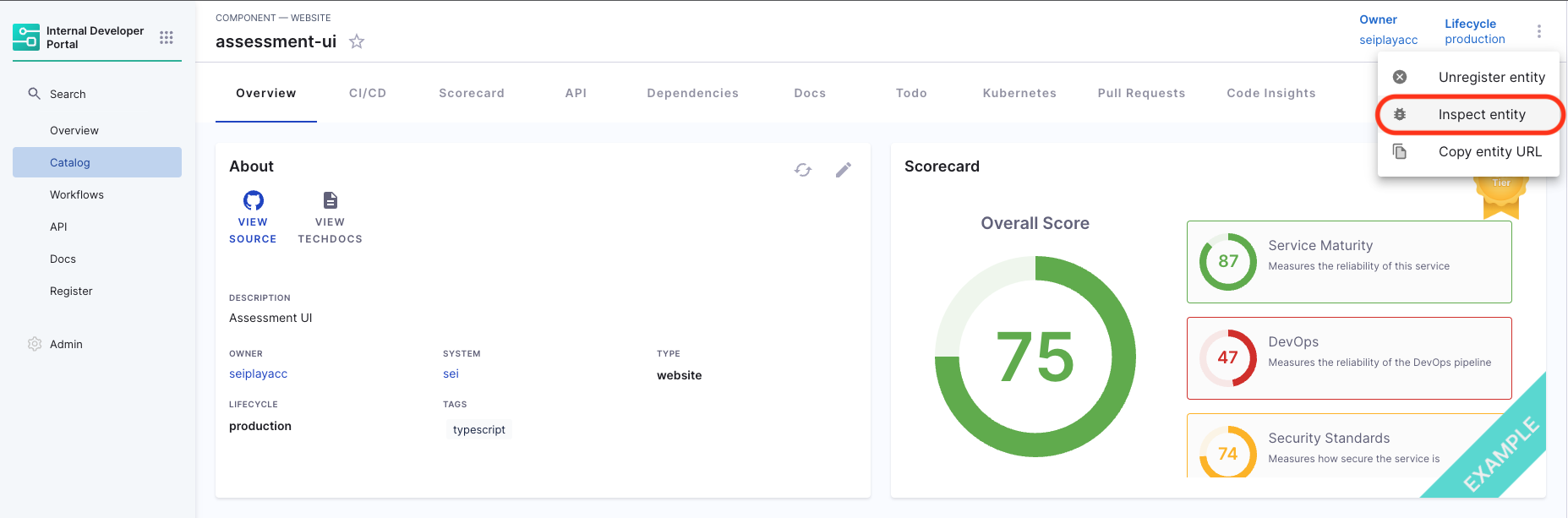 - Now go to the software component in your catalog and under the Scorecards tab you can view the scores, also you can re-run the check to compute score instantaneously.