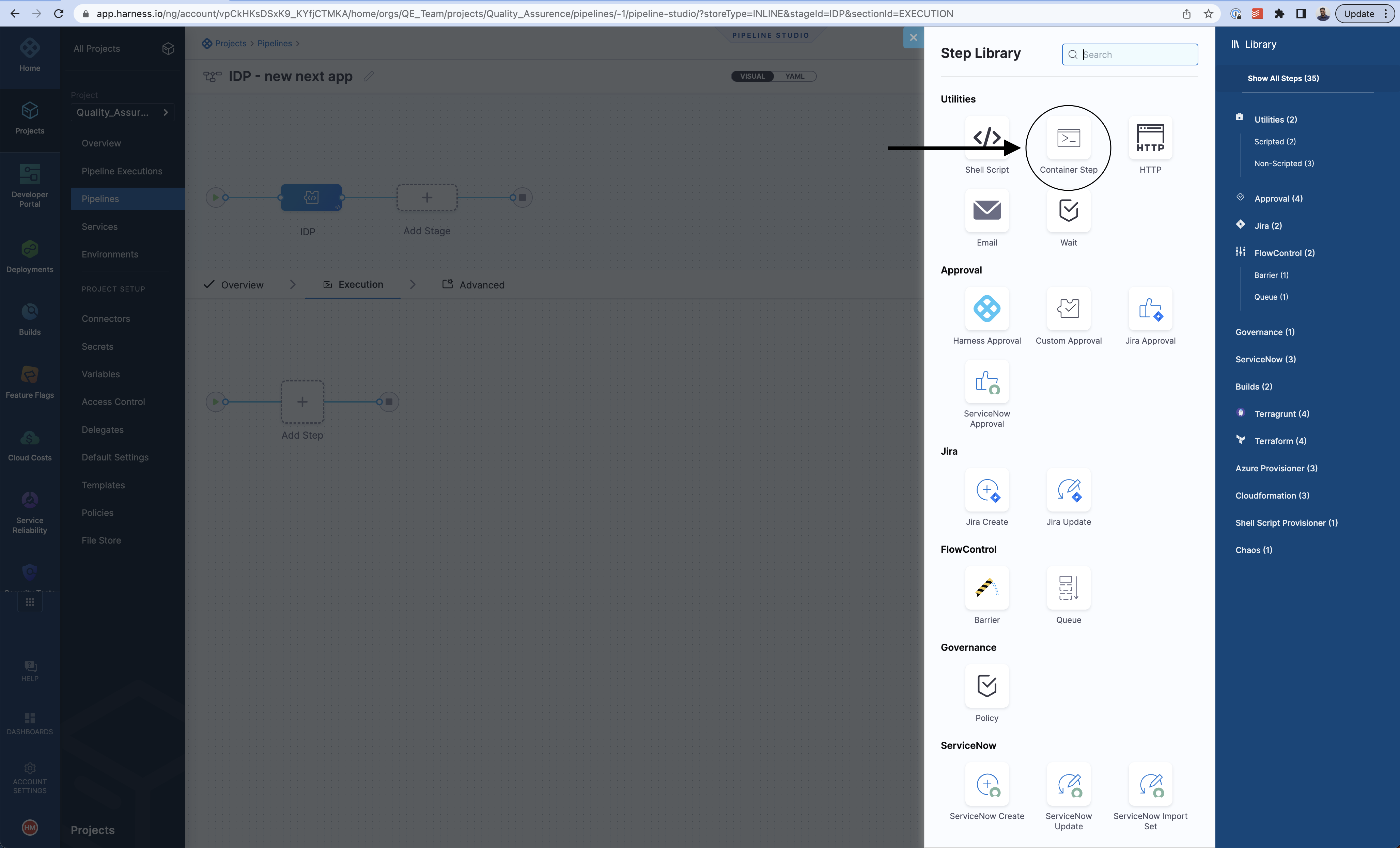 - Select Container Step to run a Python CLI called cookiecutter. We need a publicly available Python image for this purpose. You can use Container Step for any such project generators (for example, yeoman).