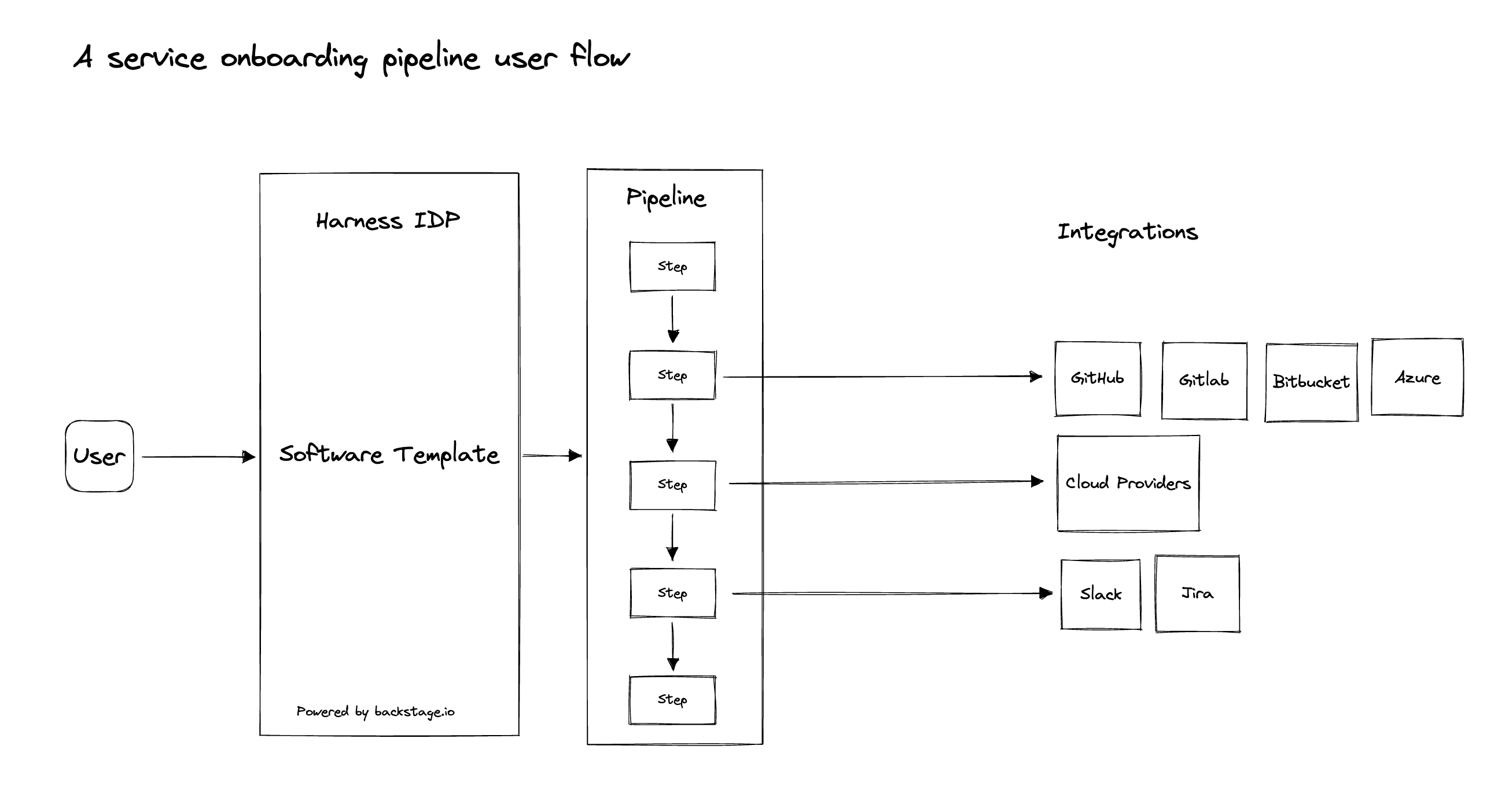 Your users (developers) must perform a sequence of tasks to create the application. First, they interact with a software template. A software template is a form that collects a user's requirements. After a user submits the form, IDP executes a Harness pipeline that onboard the new service. Usually the pipeline fetches a hello-world skeleton code, creates a new repository, and interacts with third-party providers such as cloud providers, Jira, and Slack.