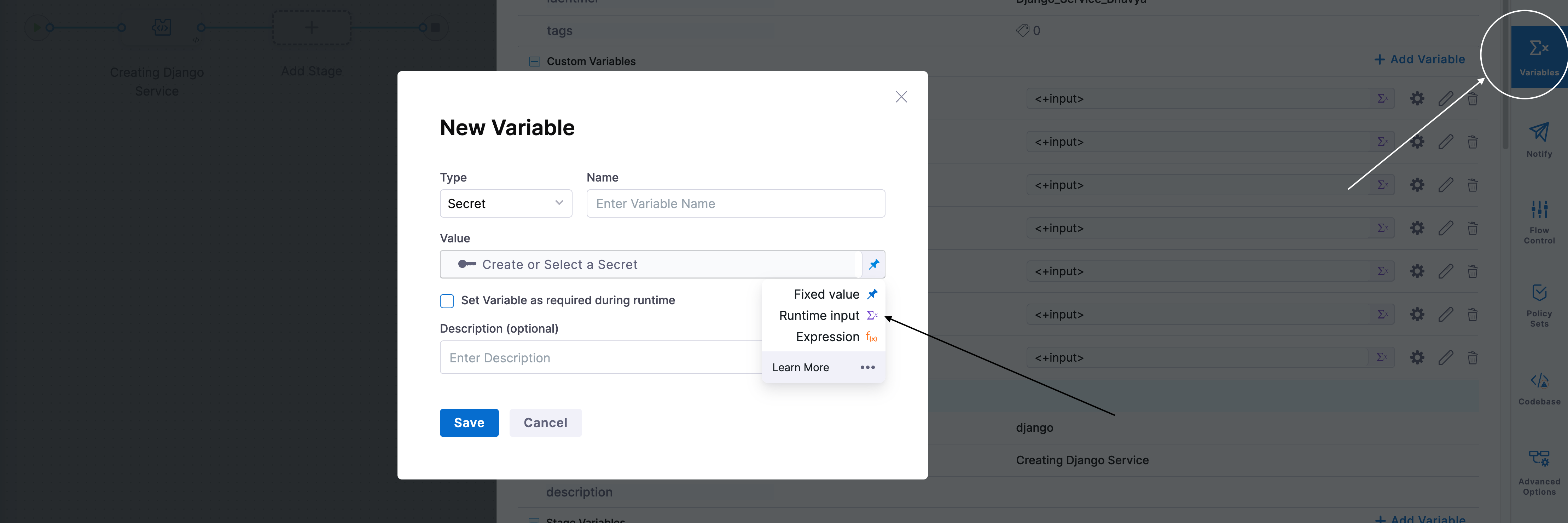 In your Harness pipeline, create a variable. Set its type to Secret and its value to Runtime input, as shown in the following figure: