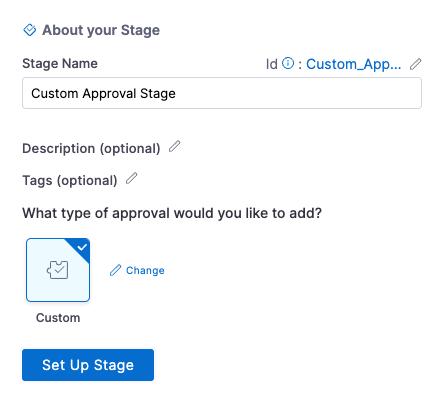 In About your Stage, enter a name for this stage, select Custom, and click Set Up Stage. The Approval Stage is set up.