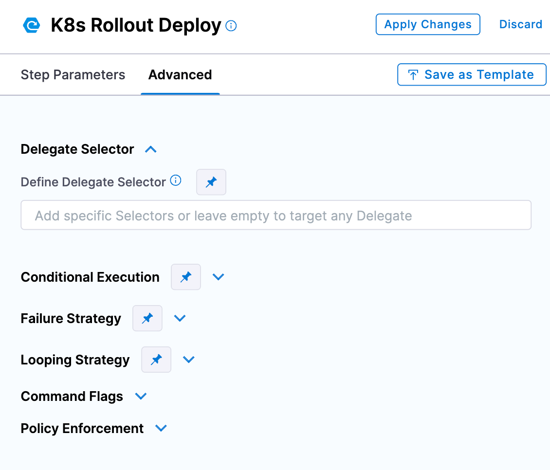 - Pipeline Steps: You can select a delegate in each pipeline step to ensure that the step only uses that delegate to perform its operation.