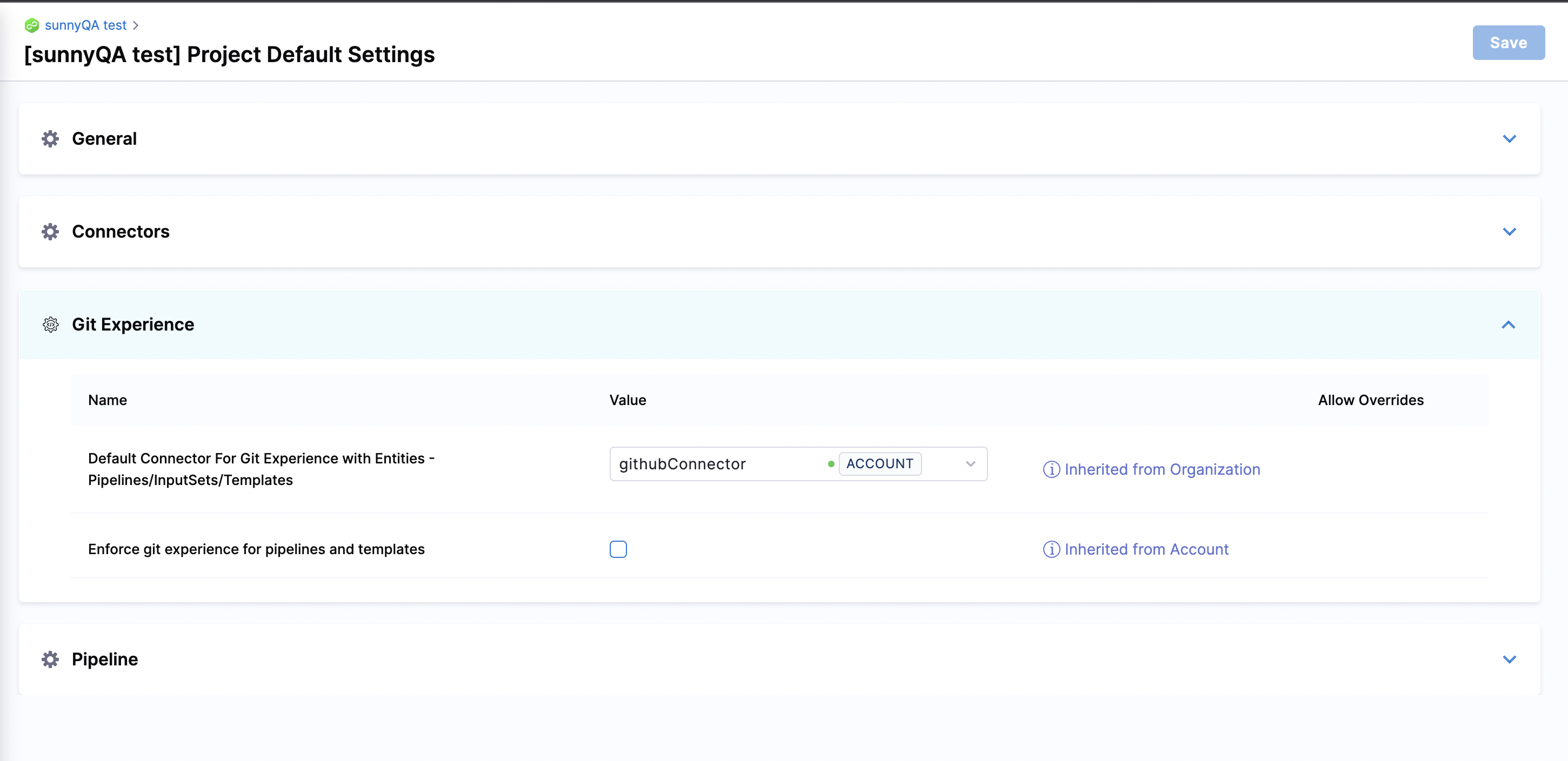 You can set the default Git connector for Git Experience pipelines and input sets. The default Git connector will be selected whenever you create or import operations with Git Experience entities.