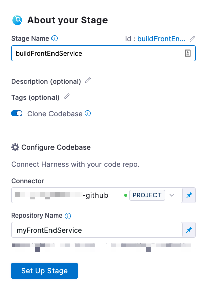 - In the Configuration tab's Repository Name field, make sure you specify the codebase repo and not the Harness repo.