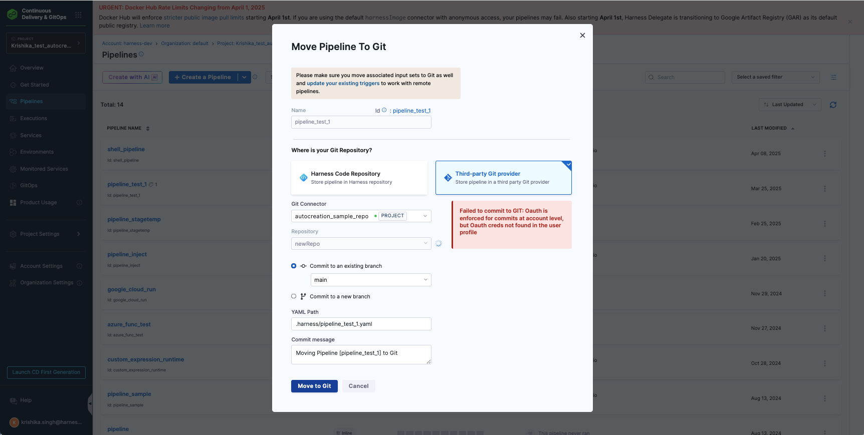 If this setting is enabled but OAuth is not configured for your account, any attempt to commit changes from Harness to Git will fail, and you'll see an error like this: