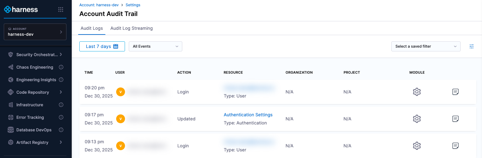 An audit trail is a chronological record of all key actions performed within the system. It shows who did what, when, and where, helping you track changes and activities in your Harness account.