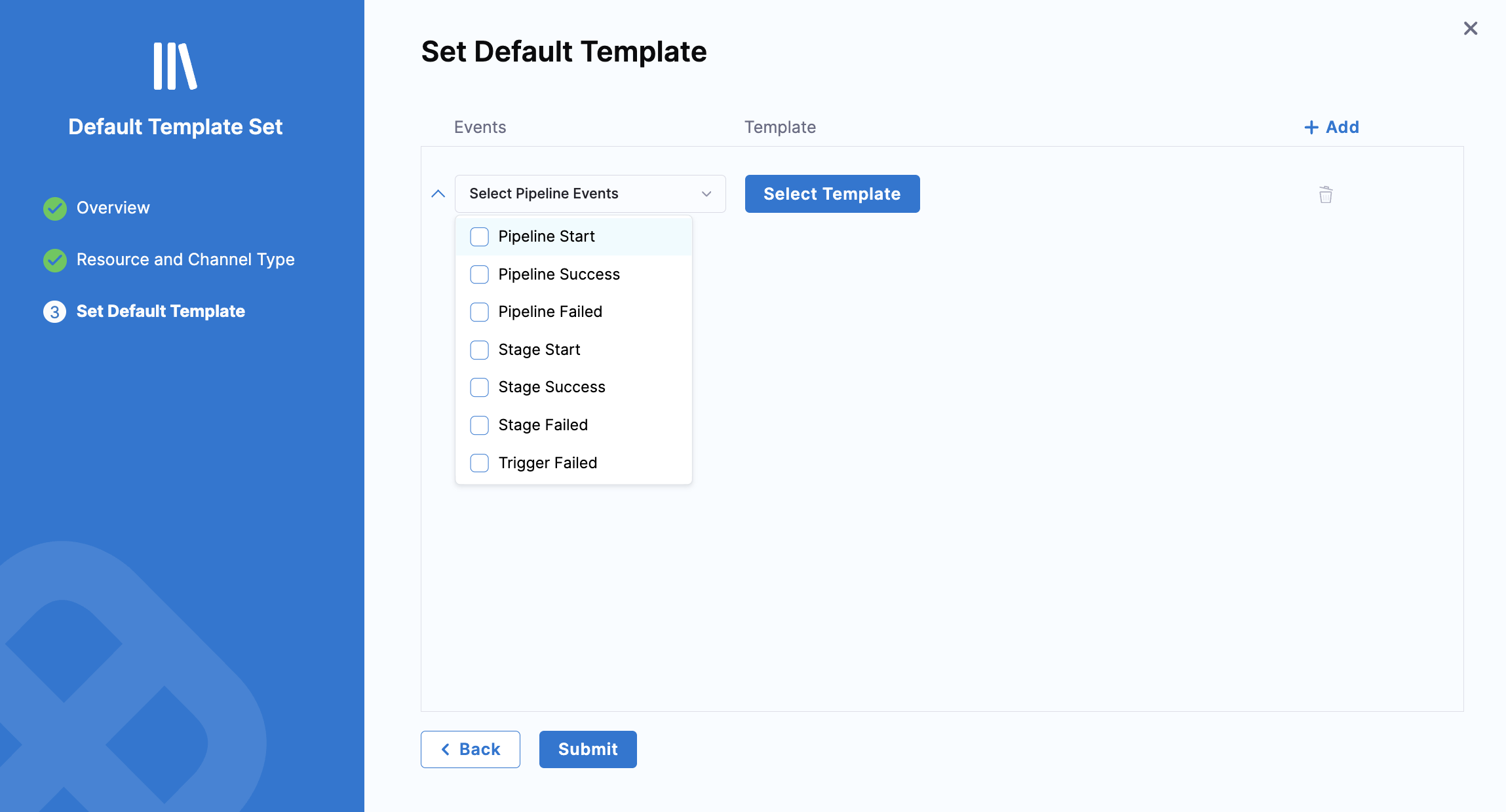 Click Select Template and choose the template to serve as the default for the selected event type. If the template includes runtime input variables, provide the required values. Repeat this process for additional event and template combinations as needed.