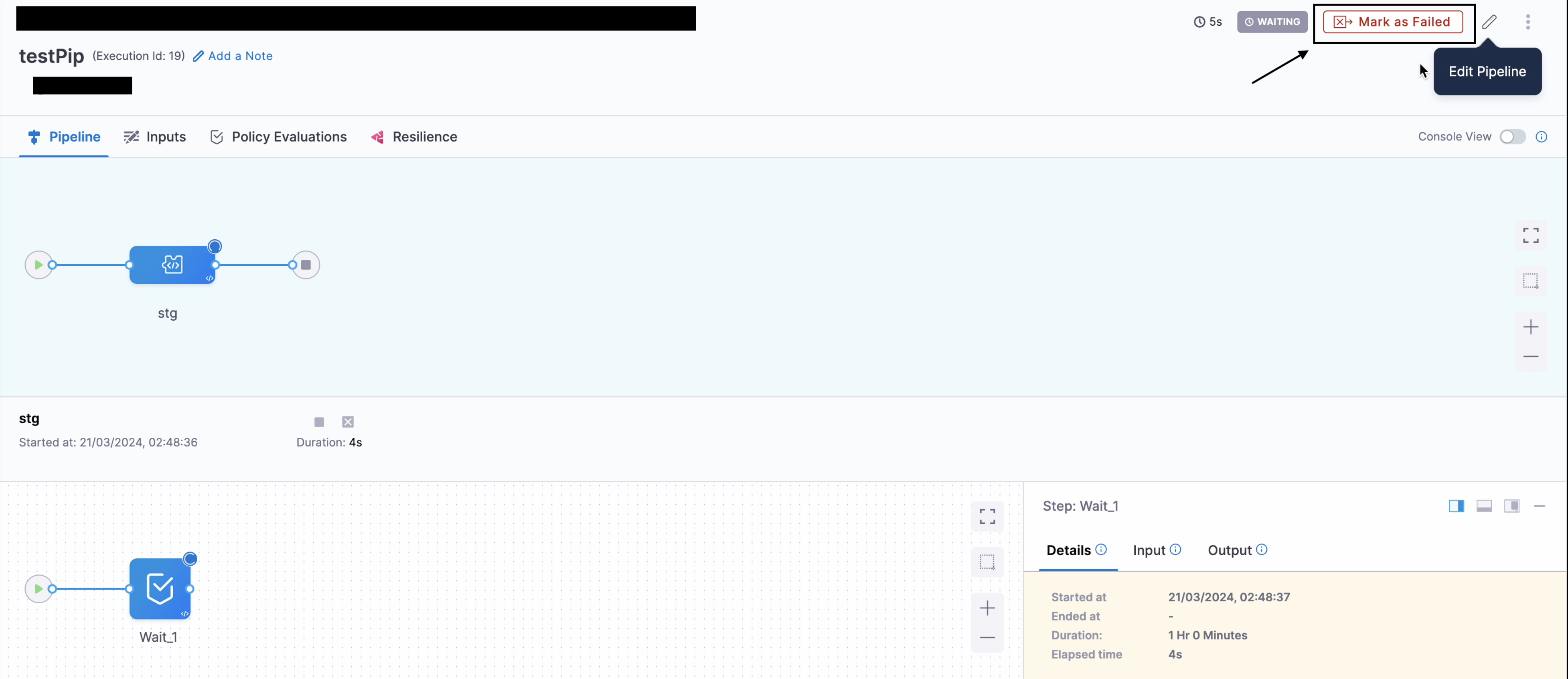 - If there is only one stage running when you mark either the stage or pipeline as failed, both options have the same impact.