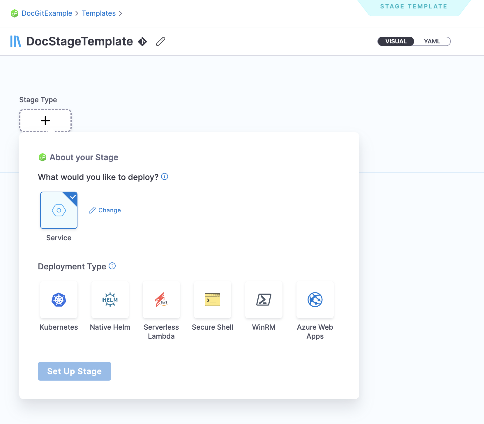 Select the type of deployment this stage must perform. A stage can deploy services and other workloads. The default selection is Service.