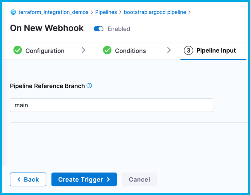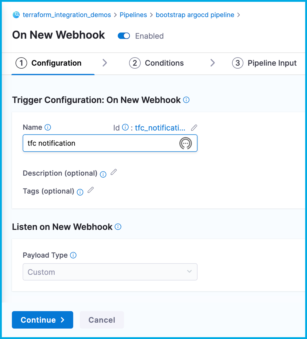 For the pipeline to listen for Terraform Cloud events, you must add a custom webhook trigger.