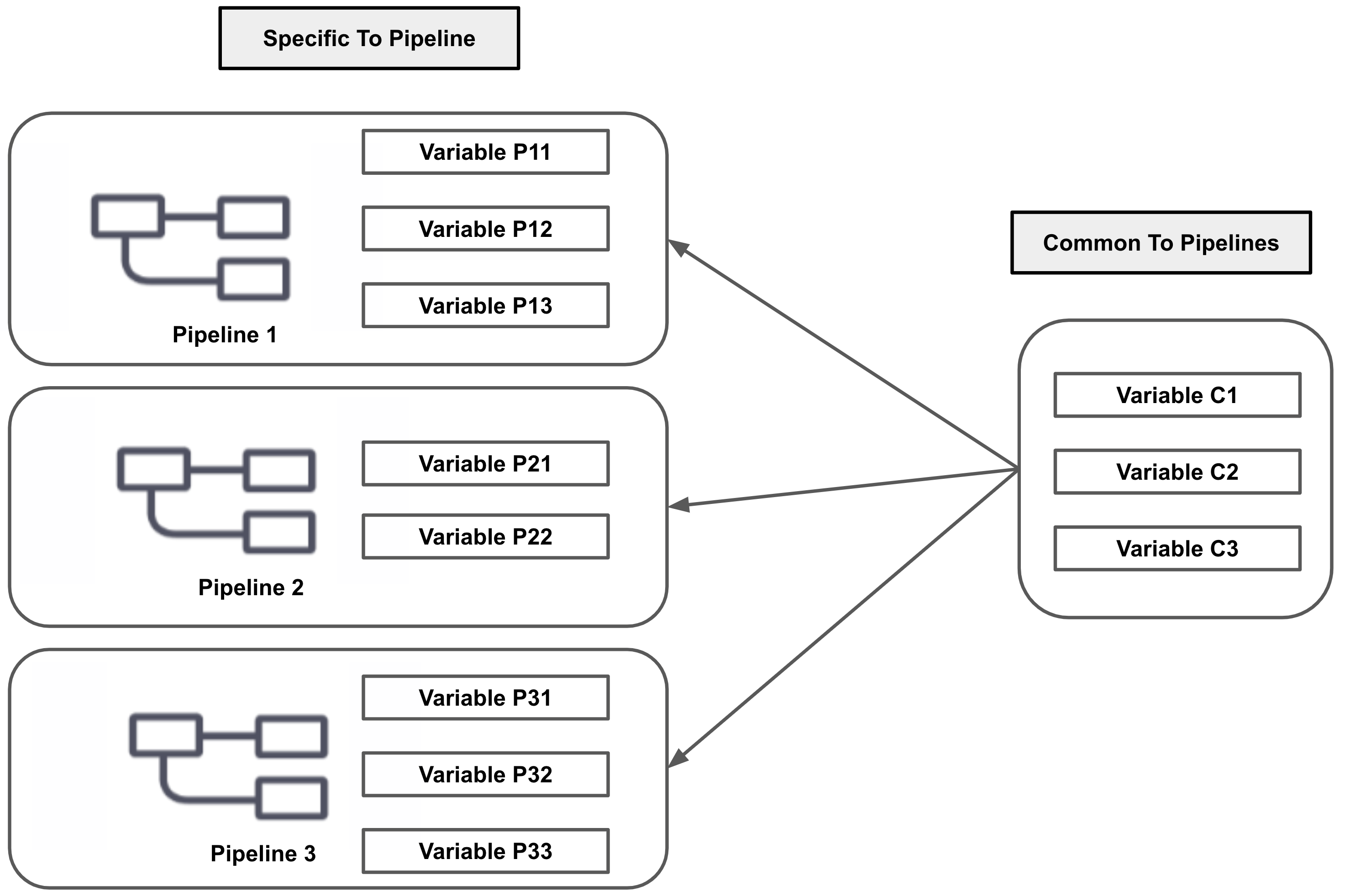 The Common To Pipelines variables represent account-, org-, or project-level variables. The Specific to Pipeline variables are pipeline-level variables.
