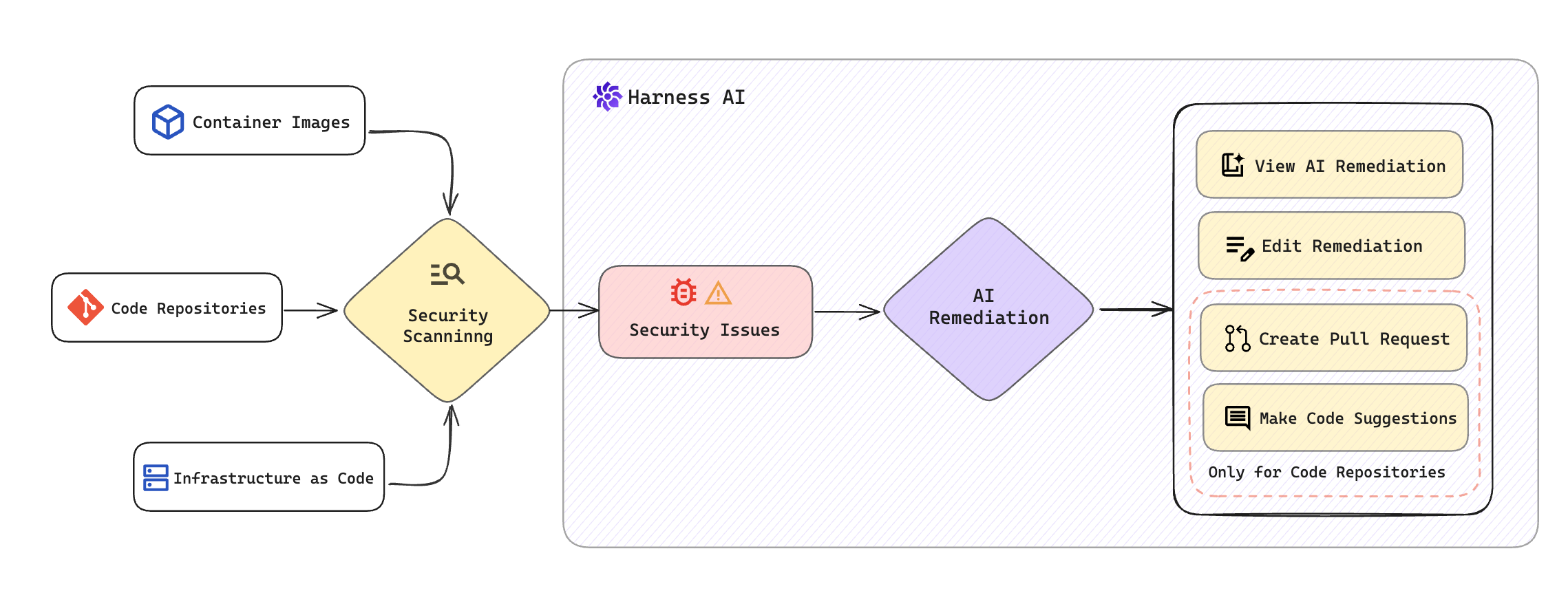 - Make Code Suggestions: You can incorporate the remediation as code suggestions into an existing pull request, available for supported code repositories and scanners.