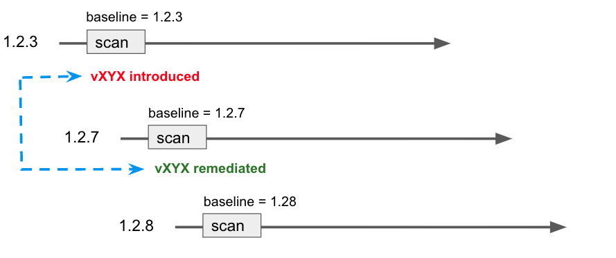 1.2.3is created. You scan this branch, which matches your RegEx, and it becomes the current baseline. - The scan detects a new vulnerability, vXYZ, with a severity of MEDIUM.
