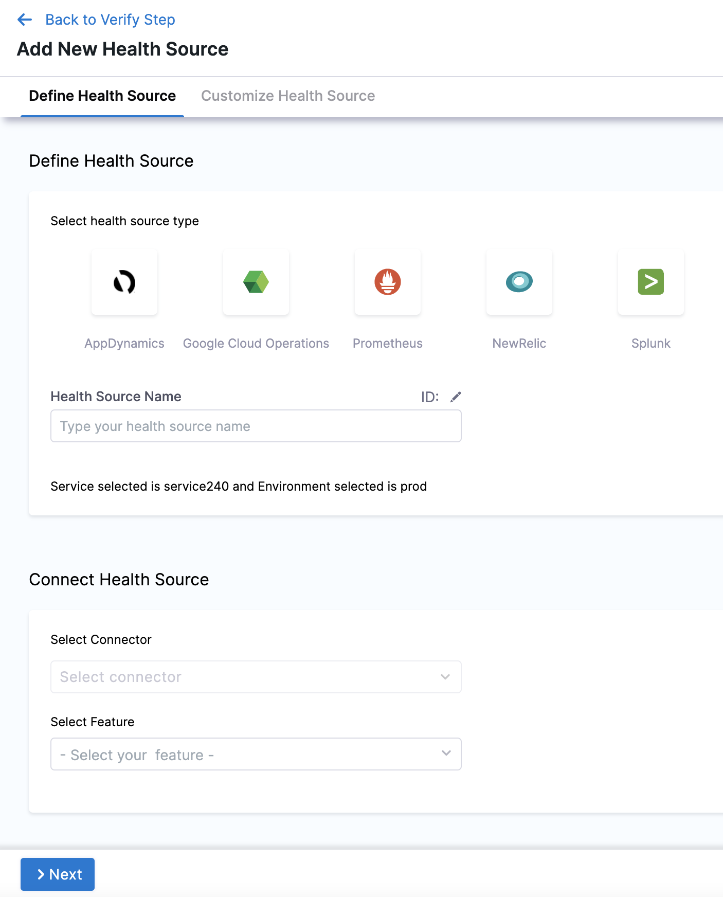 Click Next and Customize Health Source settings appear.