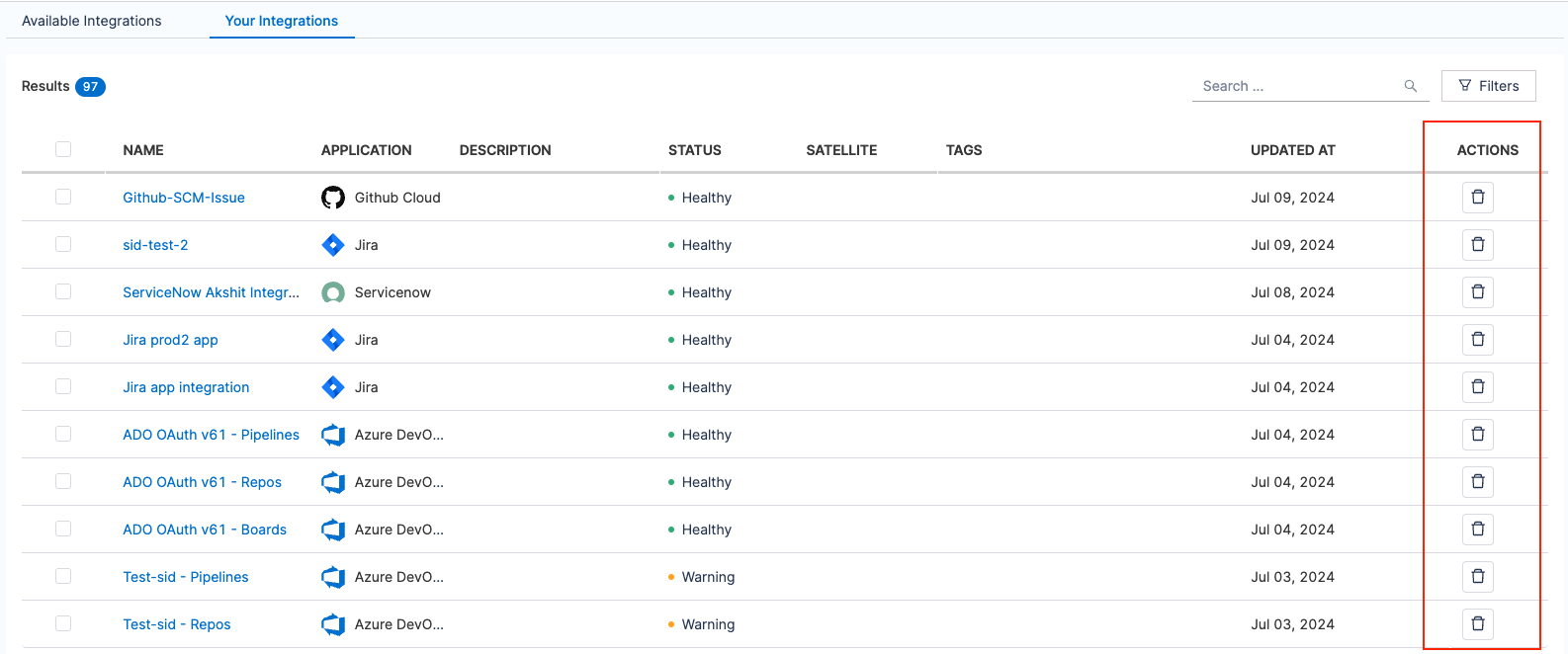 The integration status will change to Deleting. The deletion process is scheduled, and once complete, the integration will no longer be listed in the Available Integrations tab.