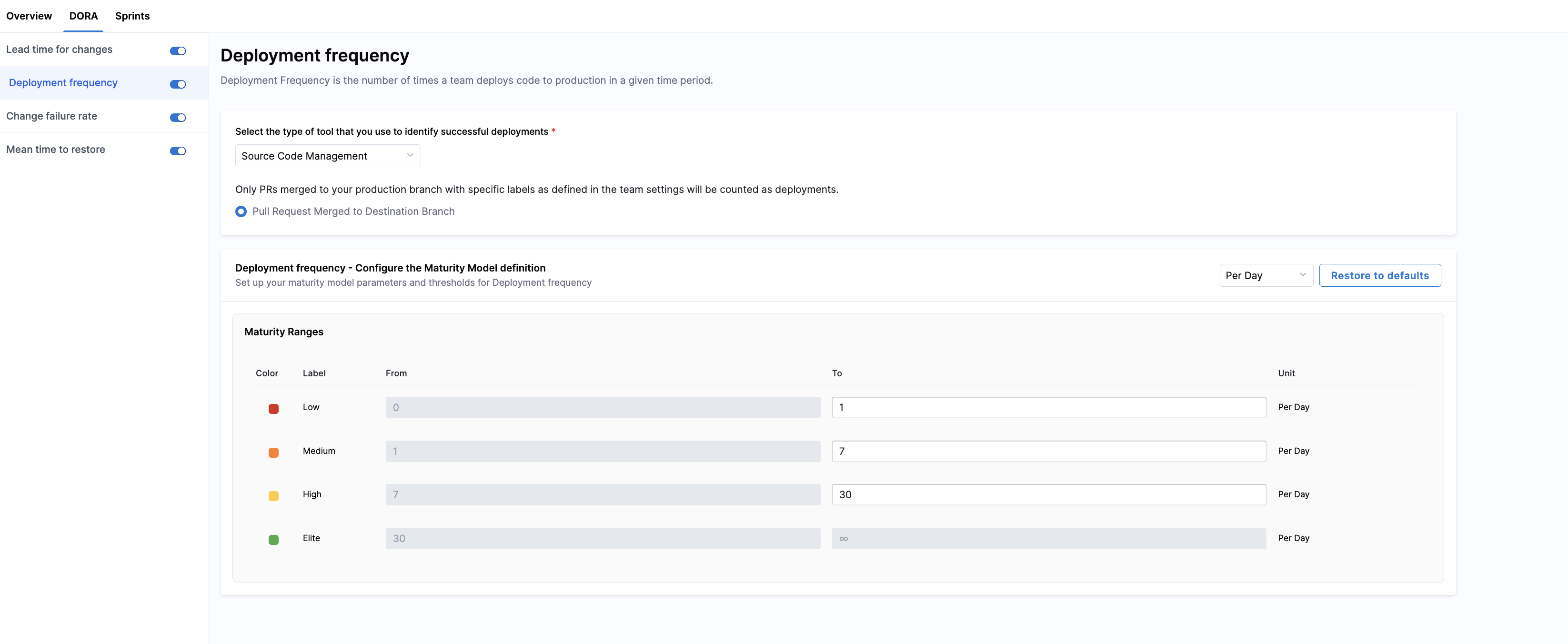 You can classify your teams' deployment performance into four color-coded bands in the Maturity Ranges section. Customize thresholds for Elite, High, and Medium performance; the Low band is automatically inferred.