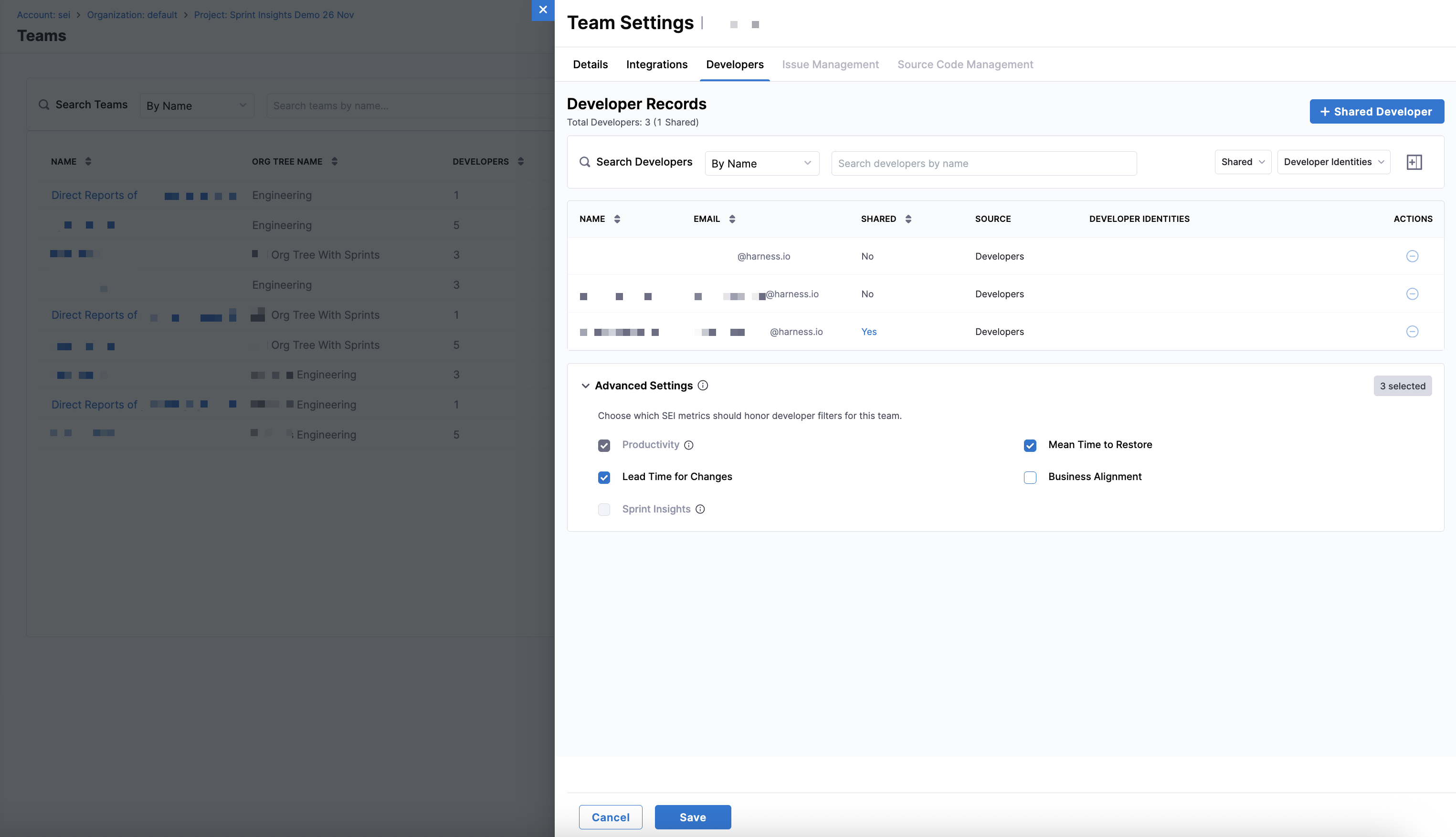 2. In the Advanced Settings section, select the Harness SEI metrics that should honor developer filters for this team.
