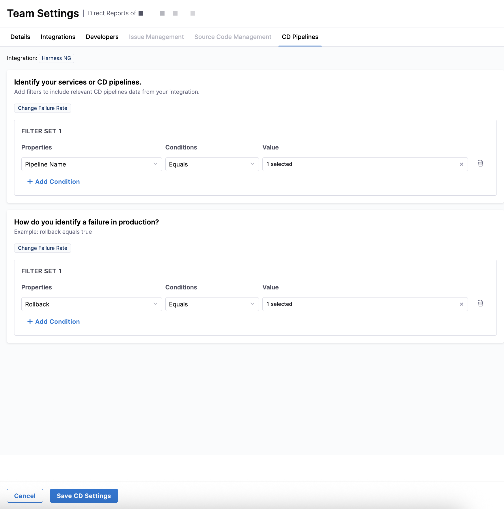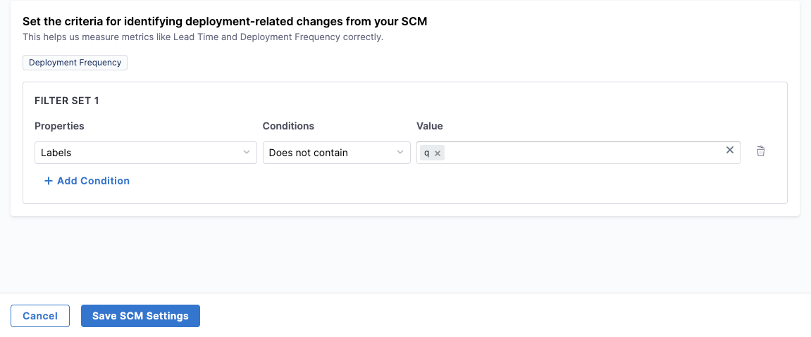 You can add multiple filter sets by clicking + Add Condition. Each additional filter set is combined using AND logic, meaning all filter sets must match for a work item to be included. To remove a filter set, click the Delete icon next to it. Depending on the profile applied to the team, this configuration can impact delivery, reliability, productivity, and business alignment metrics.