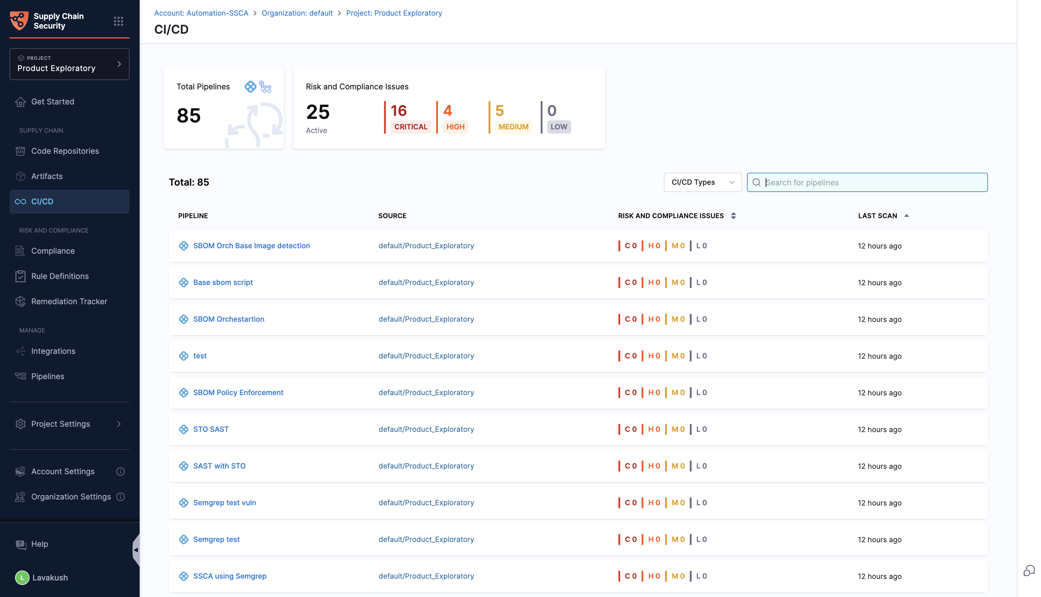 Navigate to the CI/CD section in Harness SCS to view a complete list of onboarded pipelines. This page displays all pipelines across integrations, providing an overview of their risk and compliance status, both collectively and individually.